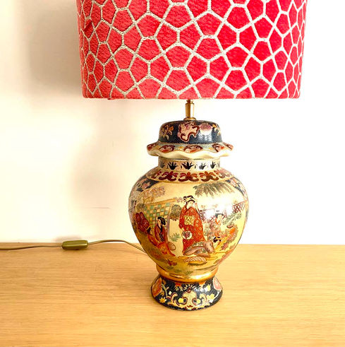 Lampenvoet gemaakt van een Satsuma-stijl dekselvaas met een knallende kleur lampenkap met geometrisch motief. Afmeting: Ø35cmxH62cmPrijs: €289,00