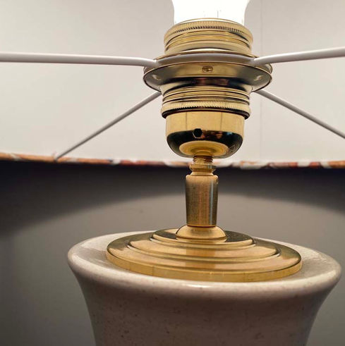 Deze vintage lampenvoet is van keramiek met lichte spikkels. Een tijdloos model wat past in elk interieur. ’s Avonds geeft zij sfeervol licht door de sjieke lampenkap die mooi het patroon laat zien als zij aan is. Voorzien van nieuwe elektra.